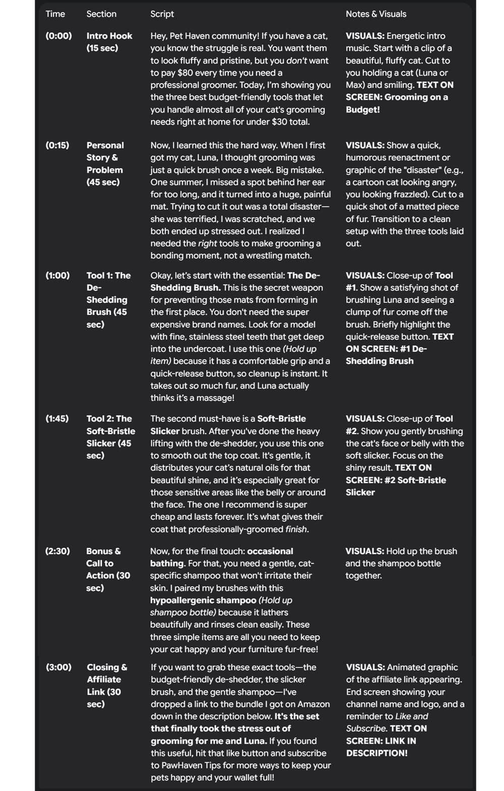 All I had to do was input my topic, select a tone (I chose “friendly and conversational”), and within a minute, it gave me a clean 3-minute script that sounded surprisingly natural. It included an intro hook, main talking points, and a subtle call-to-action for my affiliate link to a grooming brush and shampoo set I found on Amazon.