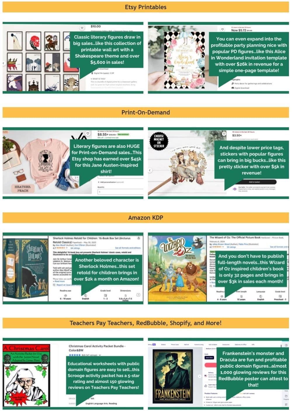 One of the most valuable insights in this system is the focus on popular public domain figures, not just “any” public domain content. While thousands of works exist in the public domain, buyers consistently gravitate toward a small group of familiar names—figures like Jane Austen, Edgar Allan Poe, Frankenstein, and others.
