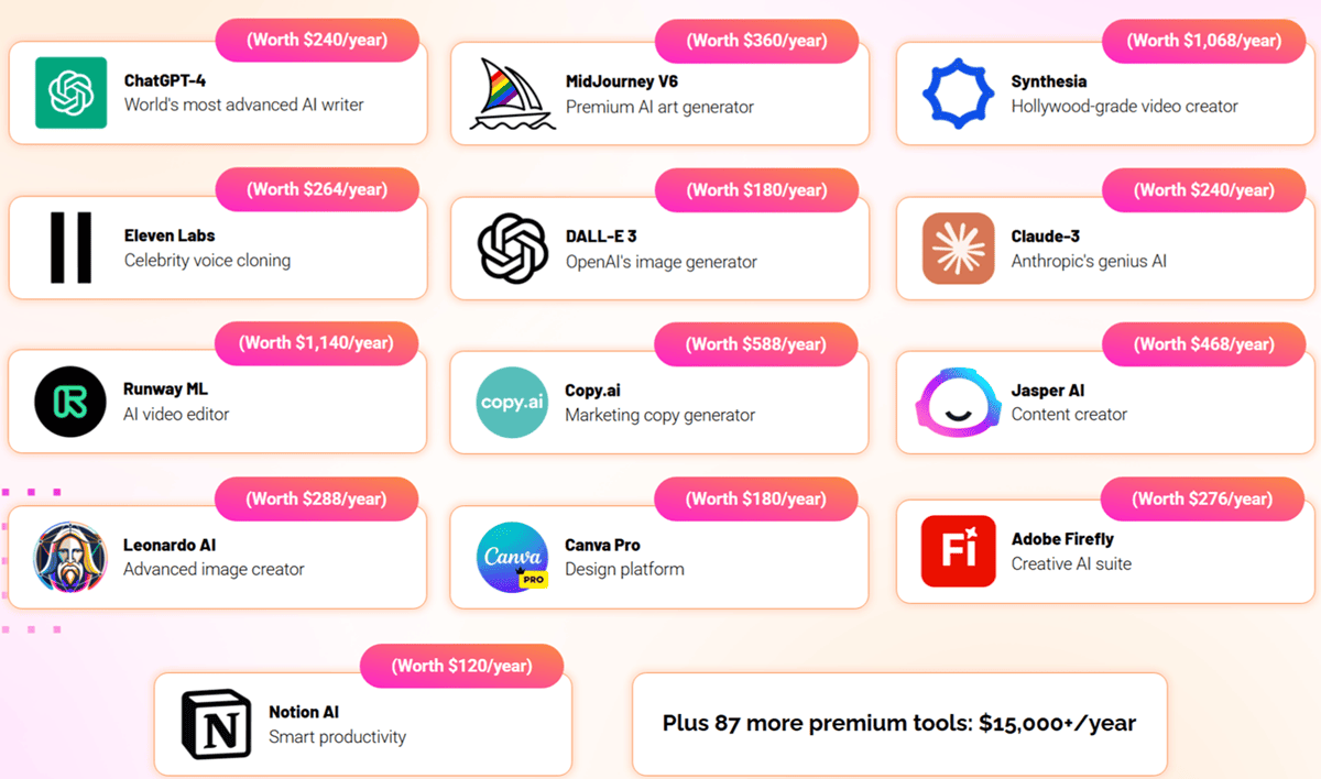 No monthly fees. No multiple logins. No tech headaches. Just one dashboard where you can write with ChatGPT-4, design with MidJourney, make videos with Synthesia, clone voices with Eleven Labs, and access over 100 other premium tools without paying extra.
